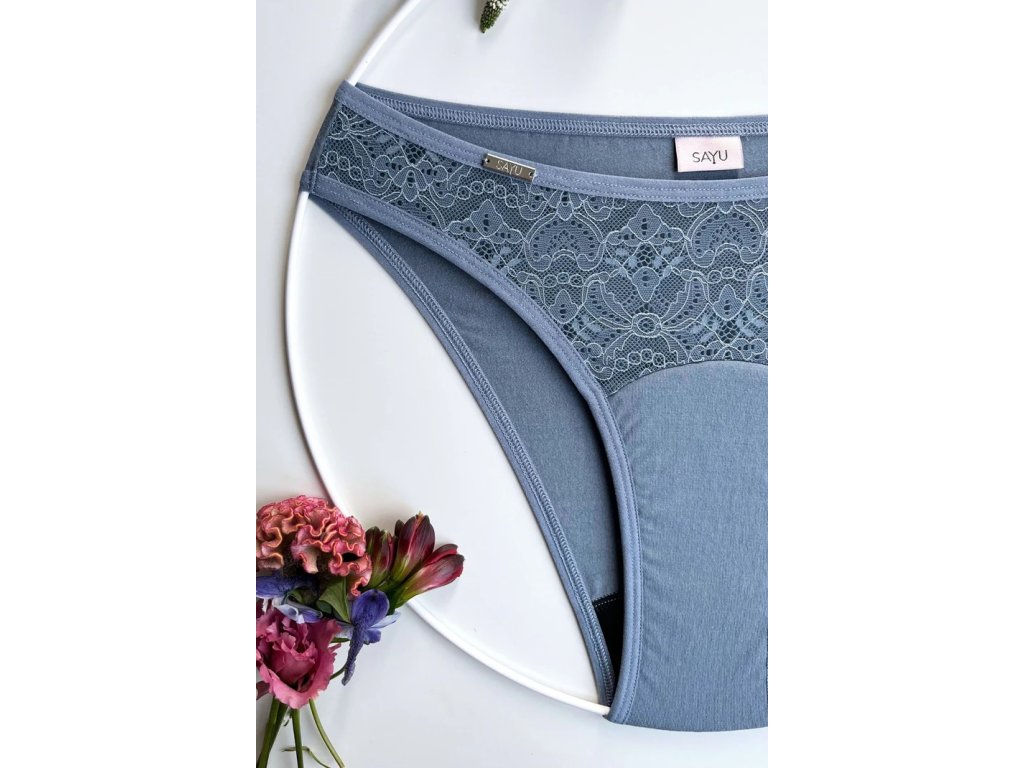 Šedomodré menstruační kalhotky s předním dílem z jemné a pružné italské krajky si ve vzhledu nezadají s vaším nejkrásnějším prádlem. Zadní část kalhotek z pohodlného modalu je navíc slušivě střižená tak, aby vykouzlila pohádkově dlouhé nohy. Díky ultra tenké vložce je můžete nosit při slabší menstruaci, ovulaci i v běžné dny. Zcela nahradíte slipové vložky, ale současně nemusíte slevit ze svého komfortu.