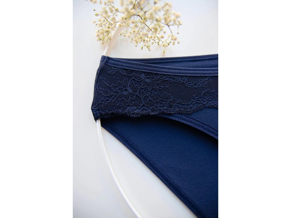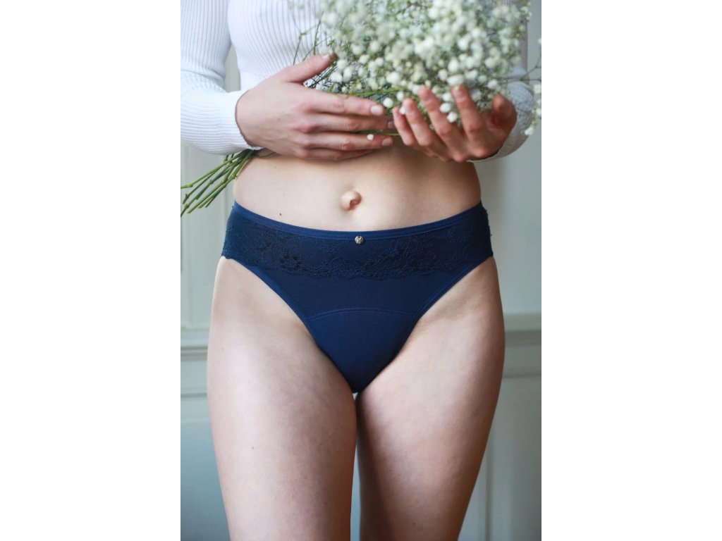Menstruační kalhotky klasického střihu s krajkou aplikovanou na vnější úplet jsou vhodné pro nošení přes den.