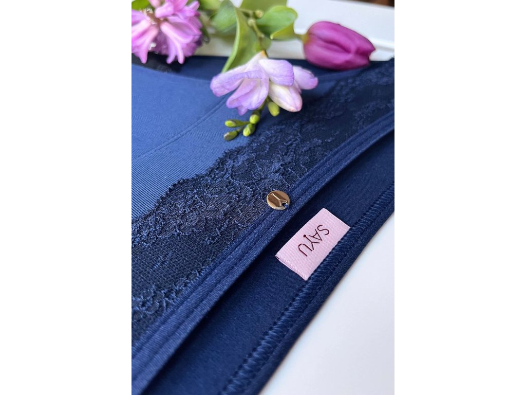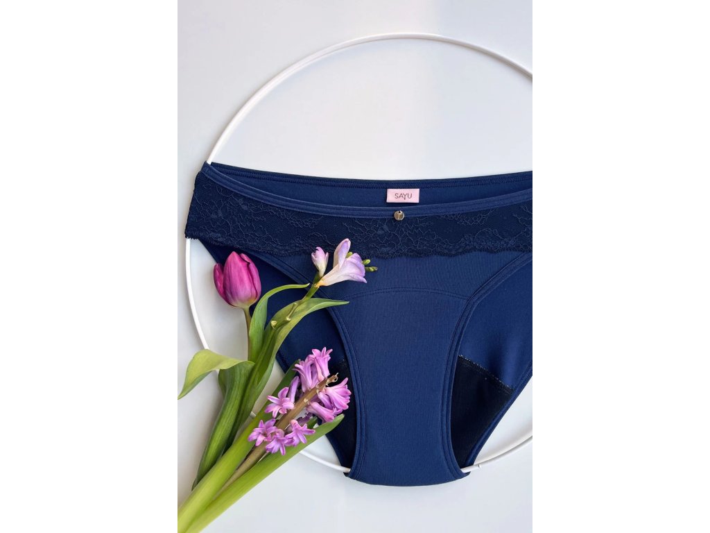 Nově jsou kalhotky ušity z pružného modalového úpletu tmavě modré barvy. Funkční vložka vysoké savosti je vybavena unikátní inovovanou savou vrstvou SAYUpro s podélným rozvodem tekutiny, vyvinutou ve spolupráci s Technickou univerzitou v Liberci. Střih kalhotek jsme na Vaše přání vylepšili, aby lépe seděl každému typu postavy. Ultra ploché pružinky jsou měkčí, díky tomu se nerýsují pod oblečením a vůbec neškrtí v tříslech.